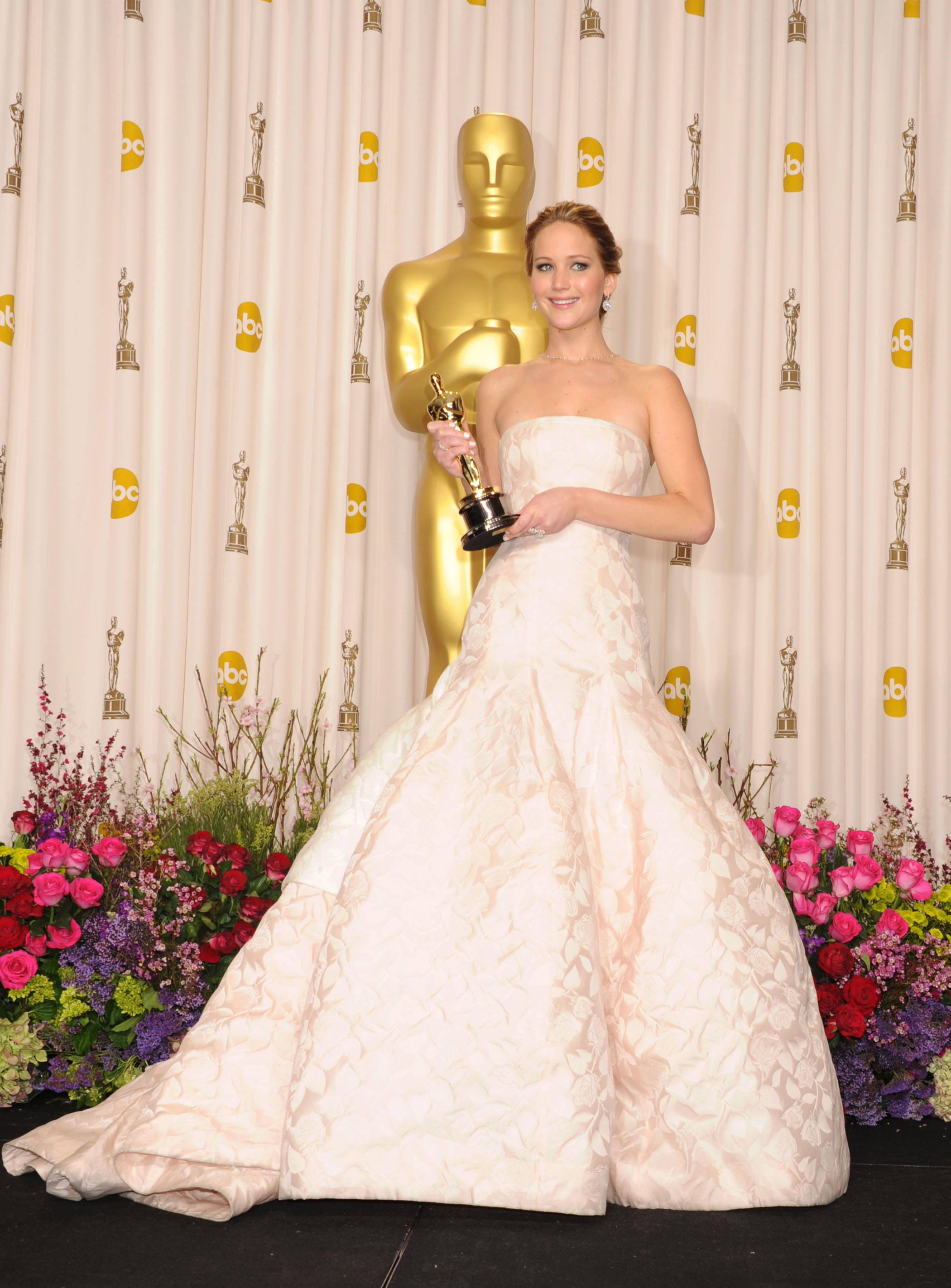Самым лучшим и культовым нарядом актрисы от Christian Dior стало кутюрное платье цвета пудровой розы, в котором она получила свой первый «Оскар». Модель из коллекции Christian Dior Couture весна-лето 2013 с открытой линией плеч и объемной юбкой напоминала раскрывающийся бутон цветка. Ирония судьбы заключается в том, что именно из-за его пышности Дженнифер Лоуренс поскользнулась и упала на ступеньках, но этот курьезный инцидент лишь придал наряду дополнительную славу. Вскоре после церемонии его стоимость выросла до 4 миллионов долларов, а модные критики назвали «самым дорогим и красивым образом за всю историю ''Оскара''».
