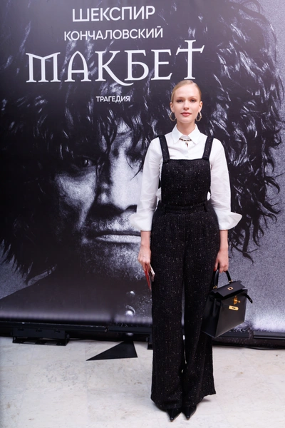 Одной из первых посмотрела новую постановку Кончаловского в Моссовете и актриса Елизавета Базыкина, которая и сама блистает на сцене куда чаще, чем в кино. Для выхода в свет звезда выбрала на удивление лаконичный образ: черный твидовый комбинезон, белую рубашку с закатанными рукавами, лакированные лодочки, серьги-кольца и золотую цепочку. А дополняла этот элегантный ансамбль сумка Hermes Kelly, цена который в среднем варьируется в районе 2 млн рублей.