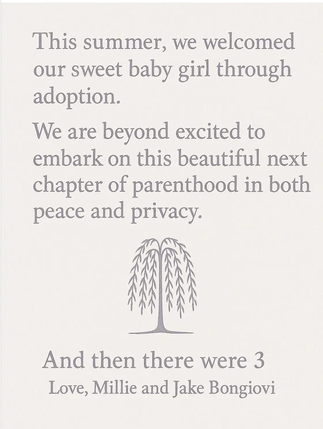 Сразу отметим: родила Милли Бобби Браун не сама и даже не воспользовалась услугами суррогатной матери. Актриса и ее супруг, Джейк Бонджови, усыновили девочку. Радостное событие случилось этим летом — точная дата не сообщается, как и имя малышки (хотя по фото из соцсетей с сообщением звездной семьи можно предположить, что девочку назвали Love. И для Милли, и для Джейка это первый ребенок — и они с большим волнением открывают для себя мир родительства.