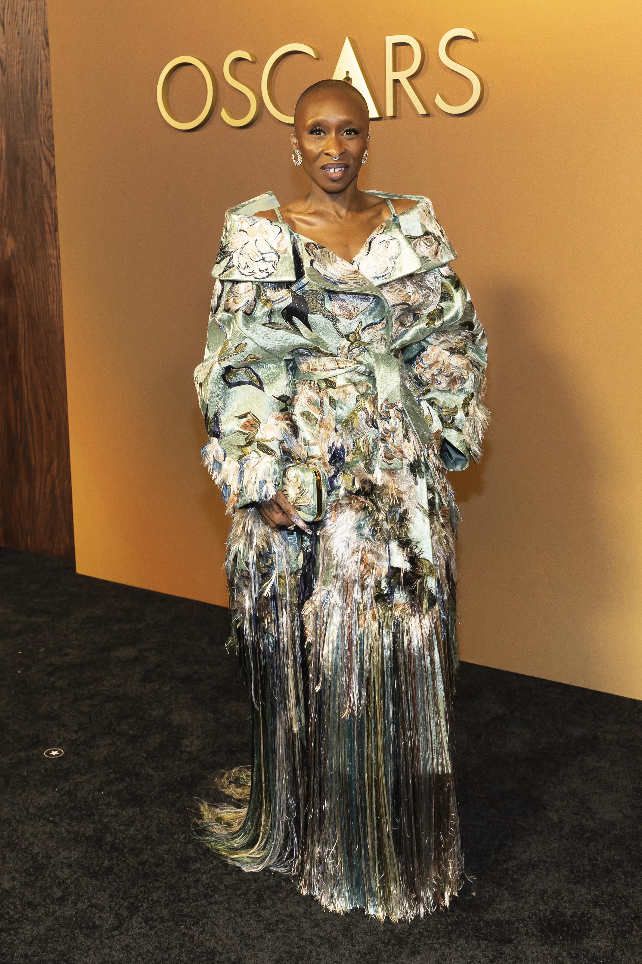 Синтия Эриво, которая просто обожает нестандартные вещи, в этот вечер вновь удивила фанатов. Она выбрала мятное платье-пальто Givenchy, полностью вышитое шелковыми нитями, которые к низу превращались в объемную бахрому. А вот Эмили Блант пошла по классике и сделала ставку на соблазнительный total red и бриллианты — беспроигрышный вариант голливудского шика, когда дорожка не красная. Она позировала в асимметричном Schiaparelli с обнаженной спиной и прозрачной вставкой на бедрах.