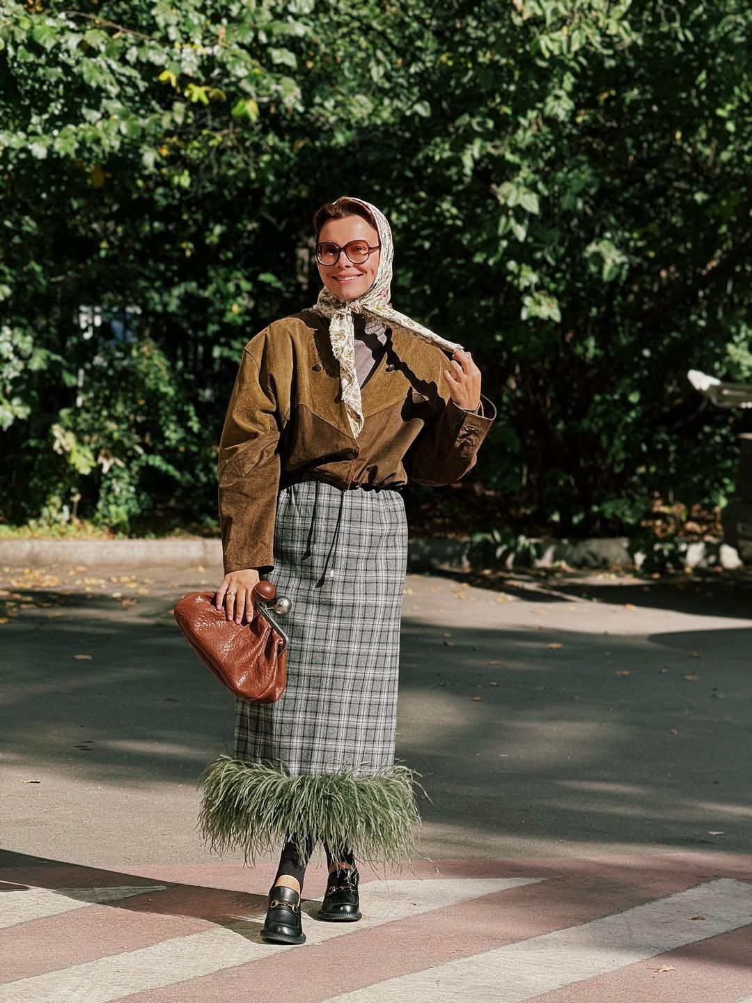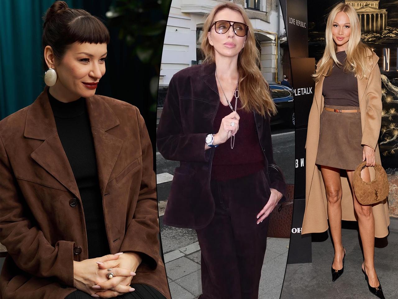 Глядя на фото в соцсетях и светских хрониках, можно с уверенностью сказать, что стилистический потенциал этого материала поистине безграничен. Он органично смотрится в рамках расслабленной эстетики Miu Miu, где пиджак цвета ржавчины сочетают с простой футболкой и теннисной юбкой. Или становится основой образа в стиле спорт-шик, соседствуя с кроссовками и анораками. Классический деловой лук с замшевыми жакетом и водолазкой приобретает неформальное изящество, а вечерний образ с шелковой мини-юбкой насыщенного оттенка — современную дерзость. Особенно красиво, вне всяких сомнений, замша смотрится именно в темно-шоколадном и рыжеватых оттенках — так она будто впитывает в себя все краски осеннего леса. Хотя наши звезды делают ставку и на цвет хаки, и на песочный, например, как Наталья Бардо.