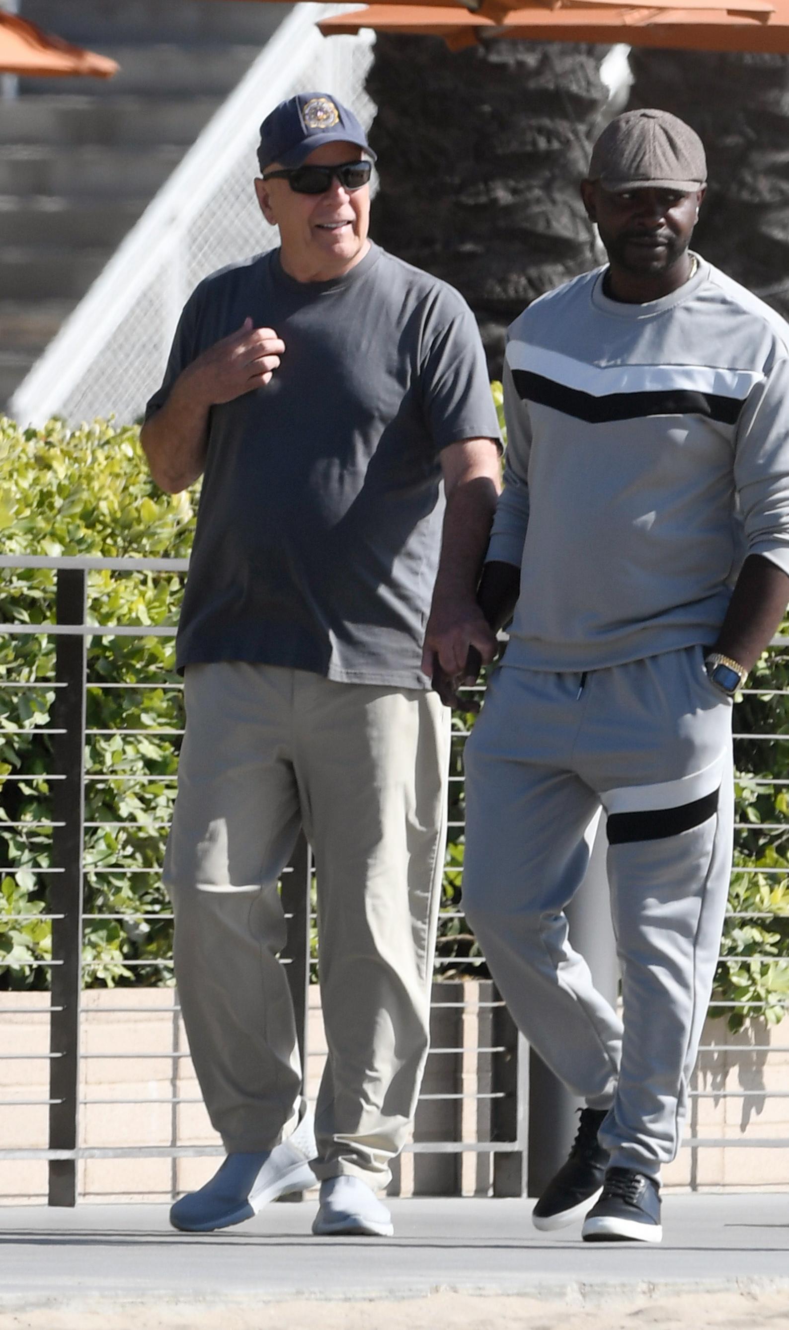 Брюс Уиллис на прогулке с помощником, 11 июня 2025 года
