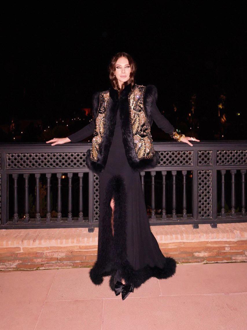 На гала-ужине высадился настоящий десант российских знаменитостей. Благодаря образу больше всего внимания к себе привлекла стилист Катя Мухина: она выбрала черную тунику с золотыми узорами и весьма провокационным декольте, а дополнила наряд необычным украшением для головы. Если вы все еще думаете, в чем встречать 2026-й год, обязательно присмотритесь к такому аксессуару. Даже если хотите после курантов просто посмотреть «Иронию судьбы» в пижаме, такое украшение точно заставит вас даже в этих обстоятельствах чувствовать себя настоящей принцессой.