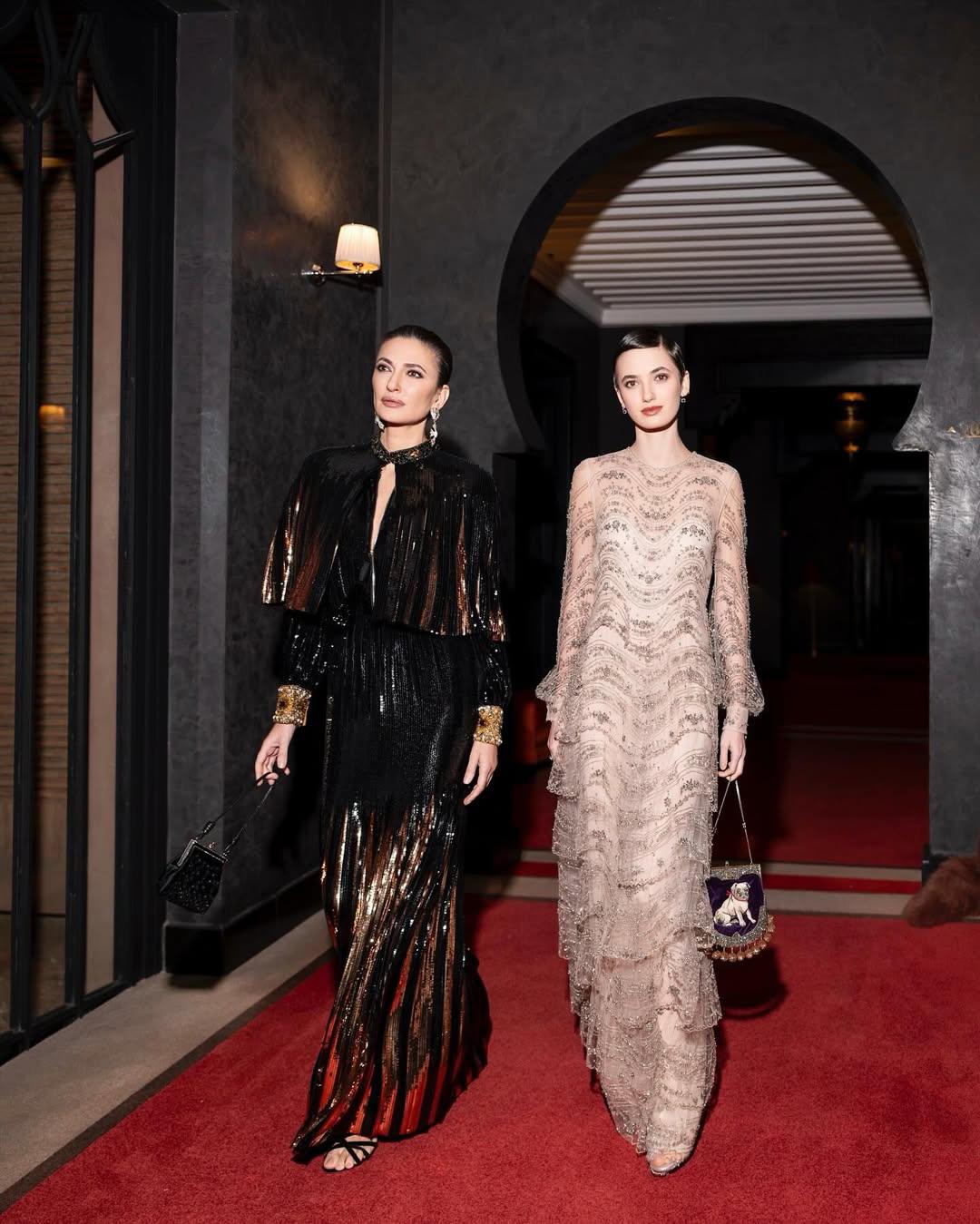На мероприятие также приехала предпринимательница Снежана Георгиева, которой в последнее время в светских выходах компанию часто составляет дочка — Софья Зуева. Несколько лет назад она окончила гимназию Капцовых и сейчас позиционирует себя в качестве модели — снимается для разных брендов. Зуева рассказывала, что еще в 15 лет начала подрабатывать хостес в ресторане своих родителей, а в 2020 году приняла участие в бале дебютанток журнала Tatler. Для вечеринки Valentino Соня Зуева выбрала платье в пол, расшитое бисером, а на плечи накинула меховое боа — тренд на slavic girl и не думает забываться. Ее мама Снежана Георгиева сделала ставку на блестящее черное платье с яркими золотыми акцентами.