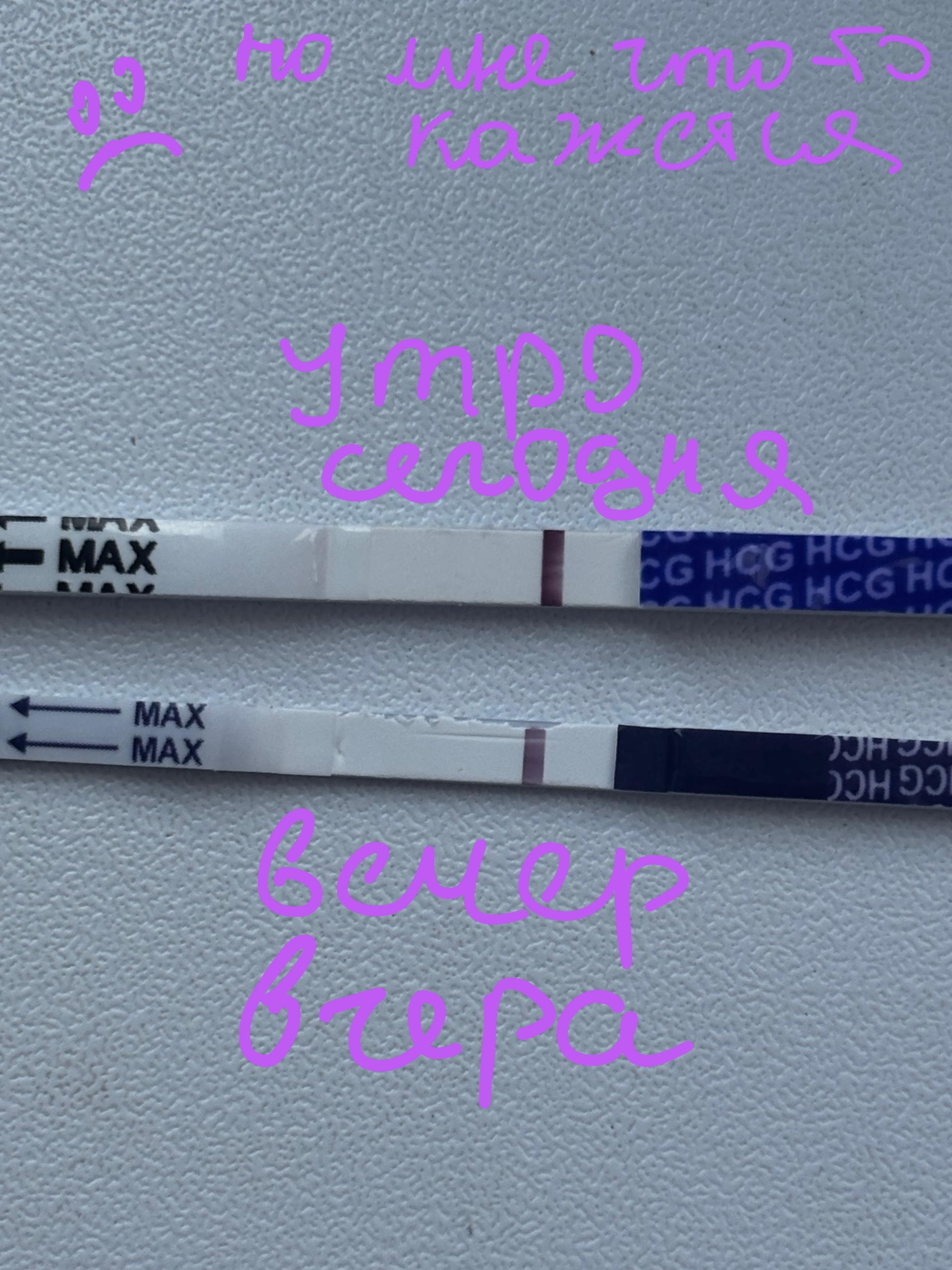 Всем привет! Я делала тест вчера и сегодня и увидела тоненькую полосочку розоватую, сегодня по ярче показал НО вчерашний вечерний показал позже 10 мин. Сегодня показал ближе к 10 мин а со времени она стала ярче